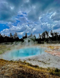 We parked, masked up (there were a lot of people) and headed out to see what we could see. It turned out we could see three different types of thermal features: hot springs, mudpots (fumaroles or pools of bubbling mud), and geysers. It was stinky (like sulphur), other-worldly, raw, and beautiful. We wondered what the indigenous people thought about this area before it was tamed with boardwalks and signs explaining the science.